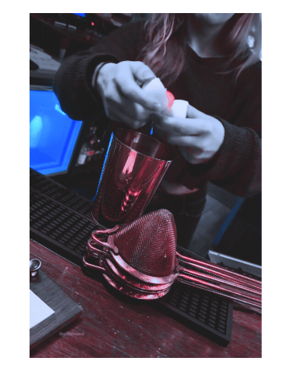 Making the cocktail, “Memories of a Prom King”: Rye Whiskey, Cinnamon Simple Syrup, Lemon, Egg White